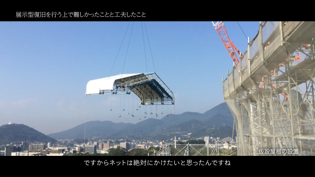 復旧工事にあたる清沢氏は「天守閣の耐震性能を高めるために、ダンパーなどを設置したほかに、屋根の軽量化も行っています。土を使って瓦を固定する湿式工法から、桟木(さんぎ)を用いる乾式工法に変更することで、大幅な軽量化を実現しました」と話し、「地震に強い熊本城」が見どころだとした。