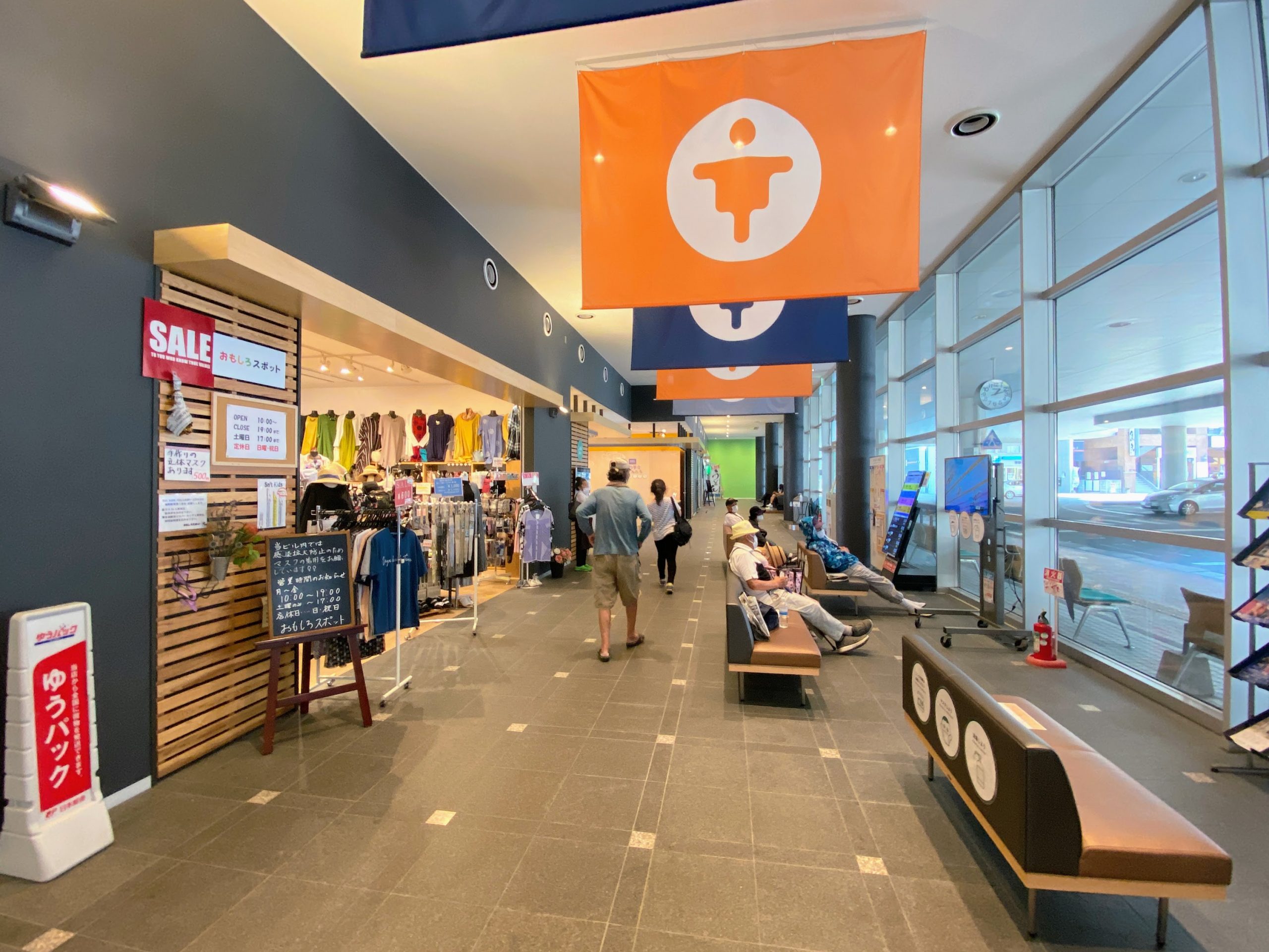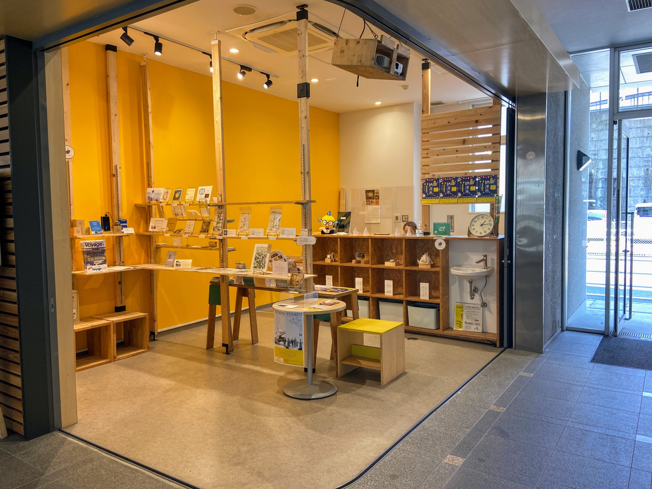 ナカイチ1階はロータリーに面し、JRからバスへ、バスからJRへ乗り継ぐ人々が行き交うターミナルだ。この階には飲食や物販のテナントのほか、「ナカイチインフォメーション」と「こととばギャラリー」がある。インフォメーションでは那珂川にちなんだお土産や、アーティスト、クリエイターのCDや書籍を販売。ギャラリーでは多彩なカルチャー展示が行われている。「今後は、近隣の企業にPRスペースとして使っていただくことも考えています」と長野さん。