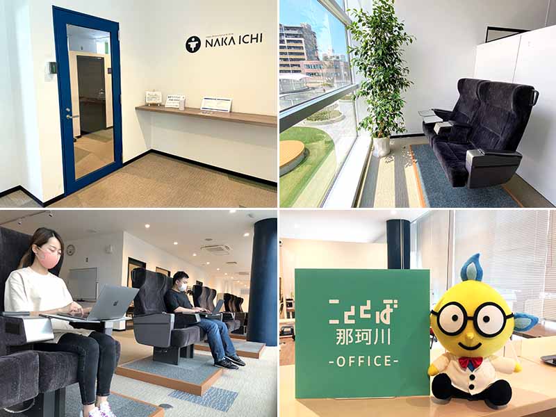 ナカイチの2階が、多様な人が入れ替わり立ち替わり、自由に使う場とすれば、3階は、一定の人が日常的に通う場だ。シェアオフィス「博多南しごと荘」は、大小16の個室と会議室、開放的なドロップインスペースから成る。ベッドタウンの那珂川に、“働く”機能を持ち込んだ。同じフロアには、ホーホゥをはじめとした民間企業と那珂川市の連携によるナカイチ活用プロジェクト「こととば那珂川」の拠点もある。