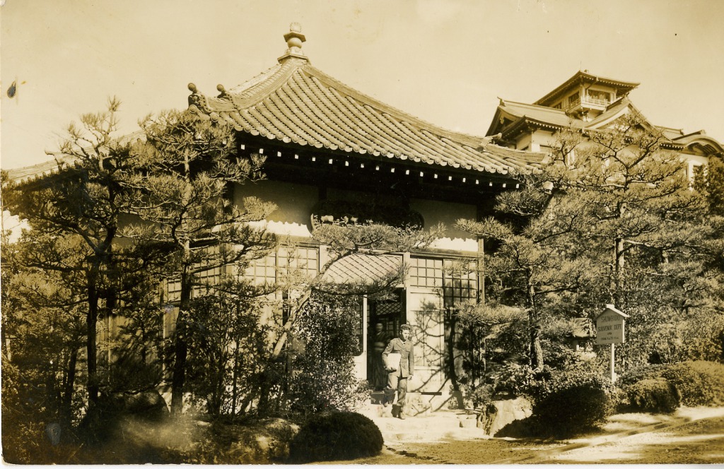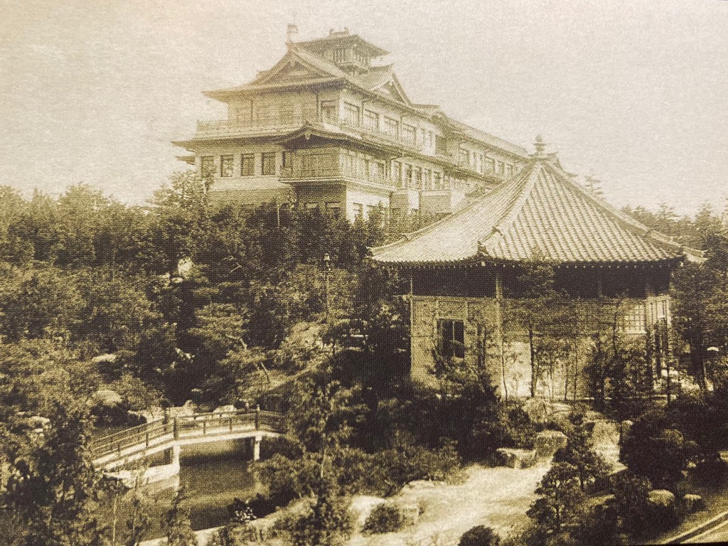 ホテルとその手前に写る聚美堂(現在の六角堂)、池にかかる橋もほぼそのまま残されている。歴史的価値がある建物として2007(平成19)年には、経済産業省より近代化産業遺産に認定された(写真提供:蒲郡クラシックホテル)戦争、災害、経営難による市への売却など、時代の変遷に飲まれながらも残ってきたホテル。空白の7年を含む歴史を後世に残すため、従業員らで構成された「蒲郡クラシックホテルの歴史を探る会」(以下、「歴史を探る会」)が2018年から活動をスタートさせている。