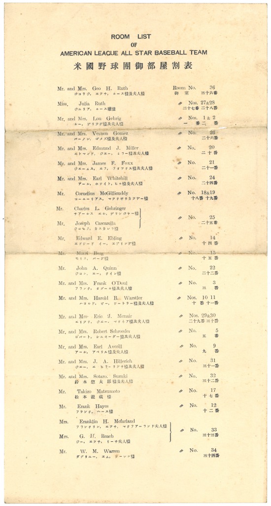 1934(昭和9)年11月に開催された日米野球の際の部屋割り表。一番上に「ジョウジ,エッチ,ルース様及夫人様」とあり、その下には「ジュリア,ルース嬢様」とある。米軍選抜チームが「蒲郡ホテル」、日本チームは「常磐館」に宿泊した(写真提供:蒲郡クラシックホテル)「歴史を探る会」の活動開始から3年。一般の方からの情報が少しずつ寄せられているという。なかでも大きな発見は、「蒲郡ホテル」開業の1934(昭和9)年、あのベーブ・ルースが宿泊したという情報だ。