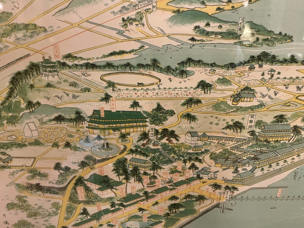 興味深かったのは、ホテルが建てられる前は城が立っていたということ。天守閣の絵が描かれた俯瞰図を元に調査していった結果、広島市立中央図書館の「浅野文庫所蔵 諸国古城之図」に描かれた不相城とホテルがあるエリアの地形が合致したという。