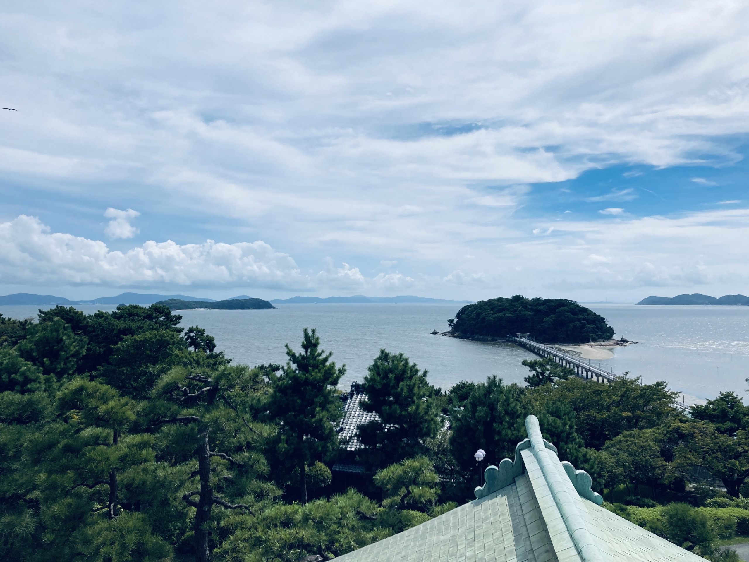 2階のテラスからの景色。銅板屋根の向こうに見えるのが竹島だ。島独自の生態系をもつことから天然記念物に指定され、蒲郡のシンボルとなっている。「常磐館」の創設者、瀧氏の助言のもと、この竹島一帯の観光地化が進められたといわれている丘の上に建てられた地下1階、地上3階建ての蒲郡クラシックホテル。敷地内の散策路や客室からは国の天然記念物・竹島を眺めることができる。一番の眺望は2階のテラスだ。銅板で葺いた屋根越しに見る竹島はなんとも風情がある。