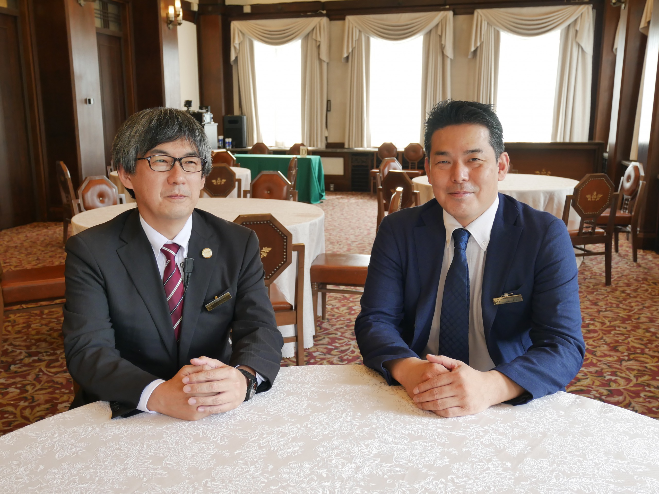 取材に対応してくださった支配人の安川氏(写真右)と、広報の山本氏(左)。山本氏は「何か出てこないかな~」と地面を掘っていることもあるとか。「蒲郡ホテル」時代はホテルの裏手に製陶所が作られていたため、今も敷地内には陶器のかけらなどが残されているのだそう戦前に建築されたホテルが令和の時代まで残ってきた理由―。