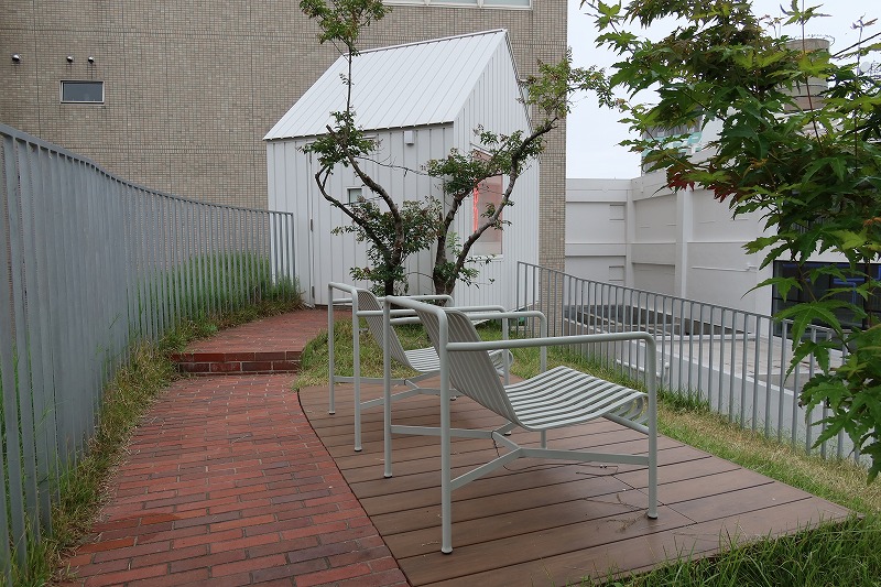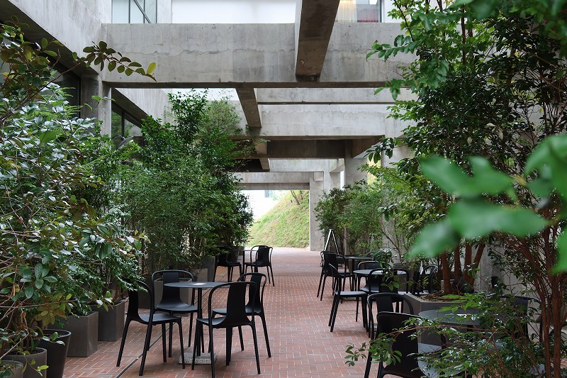 この通路は隣接する建物内のオールデイダイニング「the LOUNGE」のアウトドア部分でもあり、ランチやカフェが楽しめるようにテーブル、椅子が用意されている。ちょっとお茶でもというときに気軽に使える場なのだ。