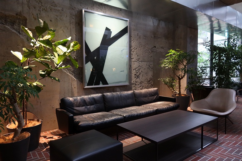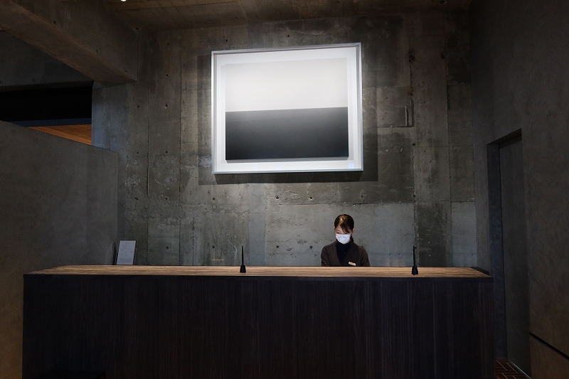 玄関を入ると正面にフロントがある。黒を基調とした落ち着いた空間で、そこにさらに静寂な空気を加えているのが日本はもちろん海外での評価も高い杉本博司氏の写真作品「海景」のうちの1点、「ガリラヤ湖、ゴラン」。