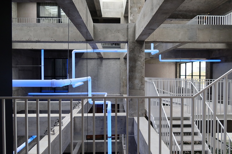 4層吹き抜け、躯体を彩るパイプアートに注目