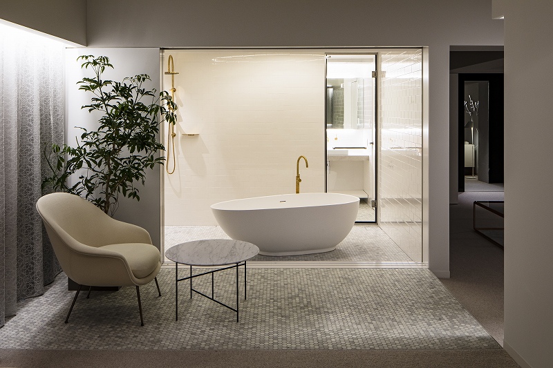 ホテル内ではいくつかの部屋を見せていただいた。最初の部屋は4階、吹き抜けに臨むバルコニーのある57m2と最も広いジュニアスイートルームだ。藤本壮介建築設計事務所がデザインを手がけ、村田峰紀、鈴木ヒラク両氏の作品が設置されている。前述した眼下に吹き抜けを見下ろすバルコニーのある部屋で、入ったところにバルコニーのあるリビング、その奥にベッドルームとバスルームがあるのだが、おそらく誰もが驚きの声を挙げるのが空間を贅沢に使ったバスルーム。