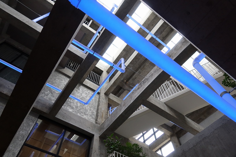 1階にはもうひとつ、オールデイダイニング「the LOUNGE」があるのだが、これが圧巻。4階まで吹き抜けになっており、そこに以前あったはずの水道管をイメージしたパイプが縦横に走っているのだ。これは前述のアルゼルチン出身の作家レアンドロ・エルリッヒ氏の作品「Lighting Pipes」。取材に訪れた日はグリーンタワーの馬場川通り沿いにブルーボトルコーヒーがオープンした日だったため、パイプはブルーだったが、通常は電球色に近い色となっており、夜10時以降はいろいろな色に変わるという。