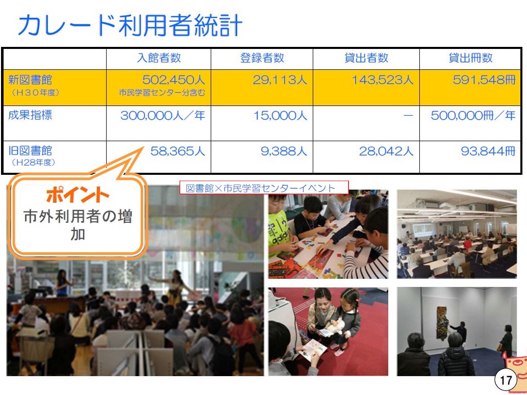 カレードにある新図書館の入館者が、旧図書館の約8.6倍になるなど、両施設には想定を上回る人が訪ね、中央地区の休日の滞在人口は増加に転じた。事例を紹介した同市生涯学習課の山崎京子氏は「金沢市のベッドタウンというイメージから、グレードアップしたように思います」と、市が事業から得られた効果を説明した。