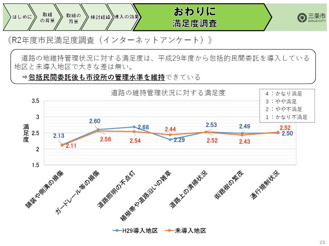 道路の維持管理に対する市民の満足度の調査結果は、包括的民間委託を導入している地区と、未導入の地区で大差はなく、包括的民間委託でも管理の水準は維持できているというのが市の見解だ。また、事業者に包括的民間委託への参加意欲をたずねた調査では、「とてもある」「ある」の合計が約半数に達し、今後の事業継続や拡大に期待が持てると、同市建設部建設課の吉澤覚氏は展望している。