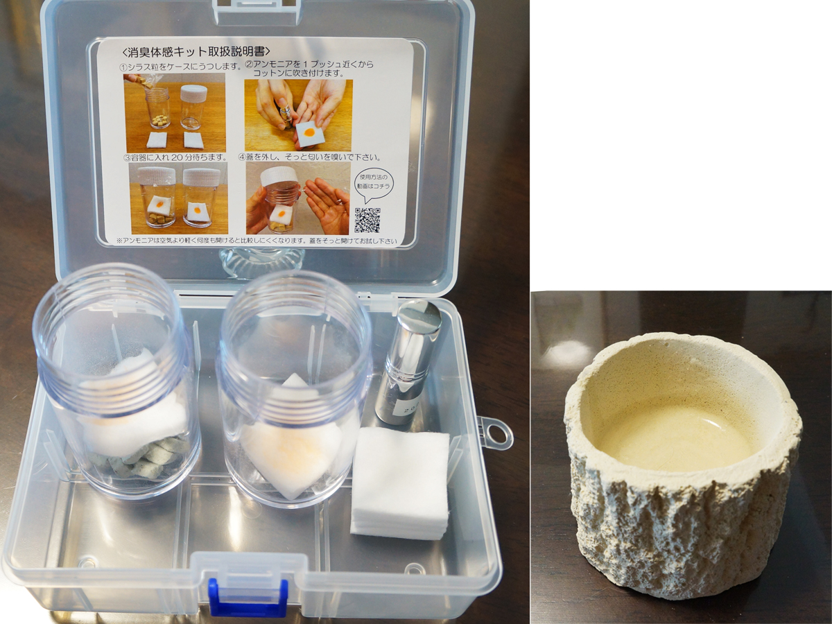 シラスの調湿、消臭効果がよく分かる実験の様子をご紹介しよう。こちらの写真の左側は消臭効果、右側は調湿効果を体感するためのキットである。