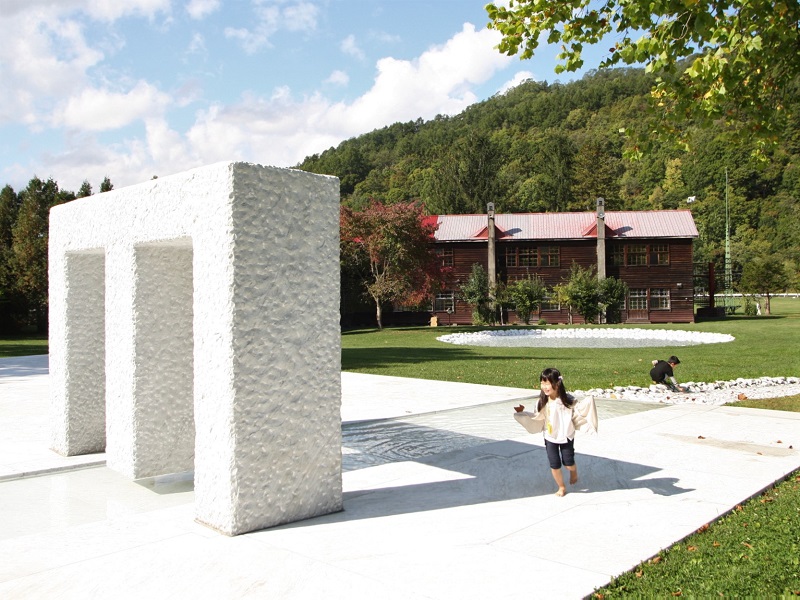 アルテピアッツァは広い。東京ドーム約1.5個分という、豊かな自然に囲まれた7万m2すべてが敷地だ。ランドマークは、旧「栄小学校」と旧「栄幼稚園」のあった木造校舎で、そばにある体育館との間には「水の広場」と呼ぶ、水が流れる彫刻作品がある。
