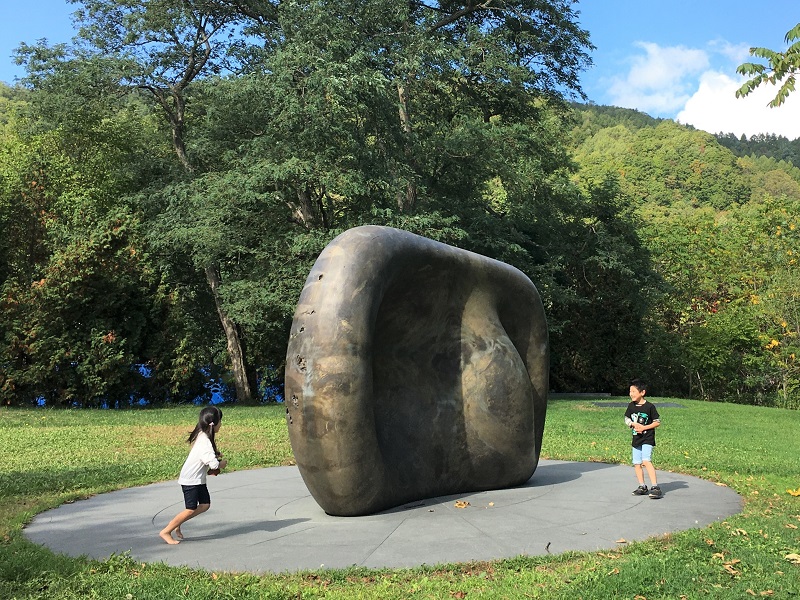 屋内外のあちこちに点在するのは、心地よい手触りの大理石やブロンズでできた約40の彫刻作品。子どもたちがよじ登ったり、追いかけっこをしたり。これらを手がけたのは、世界的な彫刻家の安田侃さんだ。