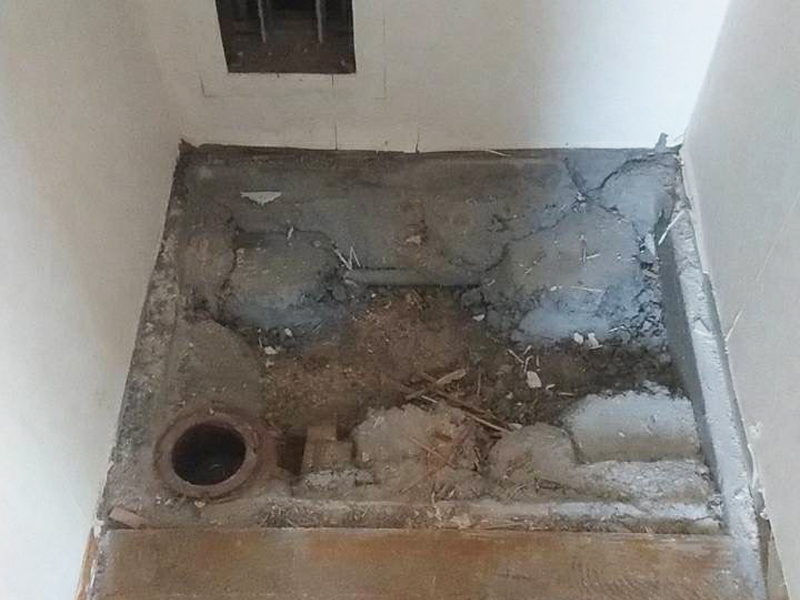 築古マンションで既存の洗濯機パンを撤去した様子。床に排水管が埋め込まれているため、新たに洗濯機パンを取り付けるためには床のかさ上げが必要になる。築古の場合、洗濯機置き場をかさ上げしているケースを見ることが多いが、使う人の身長や洗濯機の機種によっては中が見えにくくなることがあるので注意が必要だ水まわりの配管についても確認をしておこう。