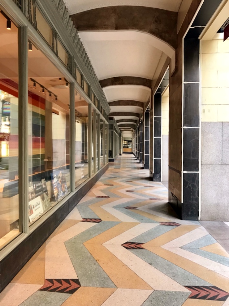 また、2階分の高さのアーケードが、堺筋に沿って約67mもの距離で続いているのも圧巻である。柱梁に黒大理石を貼り、床は三色のテラゾー仕上げの壮麗な歩廊になっている。床にも「アカンサス」がデザインされており、今なお鮮やかな色彩を放つ模様に感激してしまう。アーケード内のショーウインドウにも、細かい装飾が施されているので、当時の雰囲気を少し味わいながら歩いてみるのもいいだろう。このように、建物のデザインは当時の姿がほぼそのまま残されているが、80年以上たった今でも、スタイリッシュで気品が感じられる。