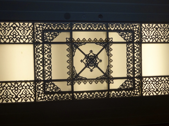 壁や柱も巨大な大理石でできており、天井には細かい装飾が施されている。ここにもアンカサスのデザインを見ることができる。また、フードホール内でも、エレベーターの痕跡や、天井の装飾などを見ることができるので、宝探しのように、建物内を散策するのも楽しいだろう。重要文化財ではあるが、寺社仏閣のように手で触れることができないものではなく、誰でも見て触ることができるのが嬉しい。