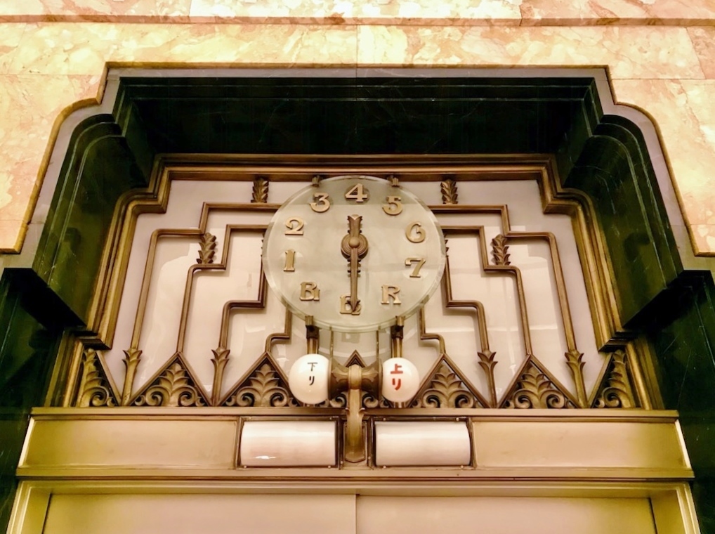 3階の髙島屋史料館の展示室奥には、エレベーターホールがある。壁はもちろん大理石だが、エレベーターの廻りは黒大理石で縁取られ、欄間や柱飾りにホワイトブロンズが配されている。重厚感があり、デザインのセンスの良さが感じられる。また、上り下りと書かれた文字や、時計のような階数表示板は、どこか懐かしいレトロ感がある。