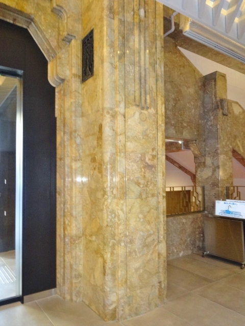 1階のエントランス左奥には、大理石でできた大階段の一部が残っている。厚みのある大理石と赤い絨毯の組み合わせがなんとも豪華である。また、手すり廻りは大理石彫刻で飾られ、装飾された照明のデザインがとてもおしゃれだ。