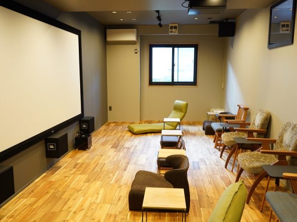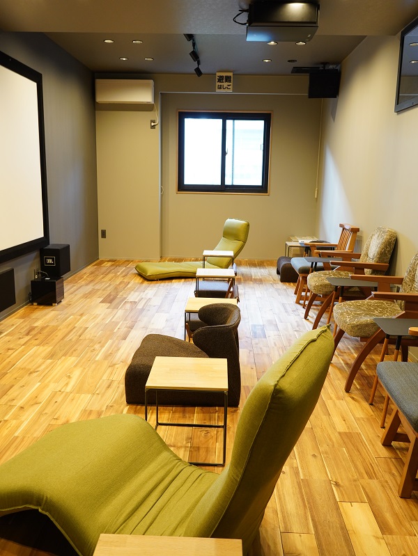 1階の入り口で靴を脱いで上がる様式となっているが、それは「靴を脱いだ方が特別感あるし、床材の木の雰囲気を足裏で感じてほしい」という林さんの要望によるもの。江尻さんは「靴を脱ぐことに抵抗がある人も多い」と初めは反対していたが、靴を脱いでいることで上映中にくつろげるので、いまでは「正解だった」と感じているそうだ。