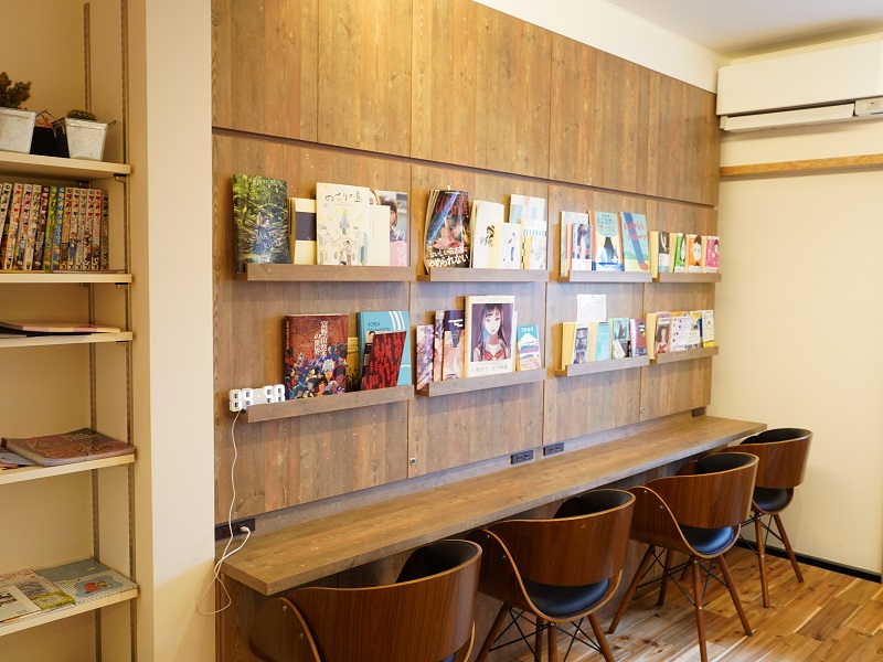 1階は、カフェに加えて、片側一面の壁をギャラリーとしている。壁を利用したギャラリーは前の店舗でも行っていて、希望者に貸し出すほか、江尻さんたちがアーティストに依頼することもある。また、上映スペースで流す作品に関連するもの、例えばアニメだったら原画などの展示を行うことも。そうすることで、施設全体で流れを作れるのも魅力だ。