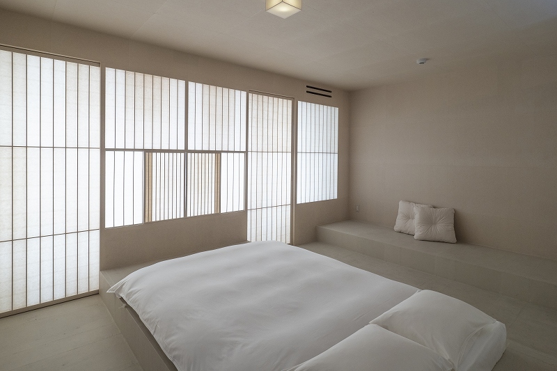 3階は宿泊者専用のフロアで部屋数はわずか6室。いずれも土間、寝室、縁側という作りになっており、漆喰と和紙が印象的。1室を除き、すべて定員は2名で、ダブルか、ツインかという違いである。