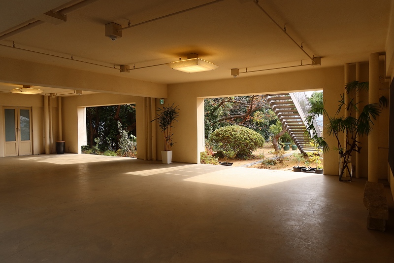入ってすぐ左手に建物があるのだが、驚いたことにL字形の建物の、海側に向いた半分ほどはスケルトン状態。一番手前の上下2色に塗り分けられた漆喰の空間には窓から光が差し込み、庭の緑、灯籠が見え、部屋全体が額縁のように見える。