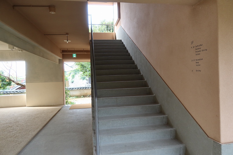 1階はこのスケルトンの2室の奥にダイニングルームがあり、L字の、少し段差のある山側には階段があり、その上にはレセプションとショップ、オフィスがある。