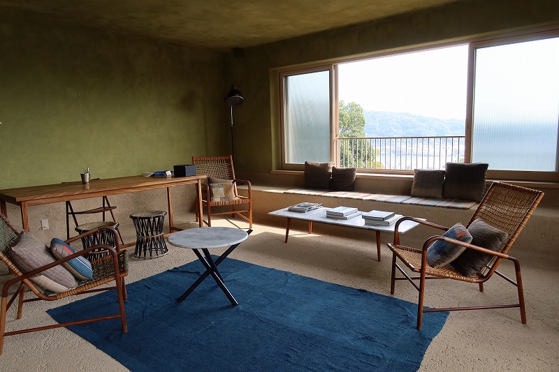 3階には宿泊者専用のライブラリーもある。ここは最上階角部屋という建物内でもっとも見晴らしのよい部屋で、ダイニングの緑よりも一段淡い、セージグリーンに彩られており、窓を開けると海と斜面の風景が広がる。LOGの近くにはかつて作家の志賀直哉が短期間暮らした家があるが、彼がそこで見た風景がここにはいまだ残っているとビジョイさんが感動した空間でもあるそうだ。