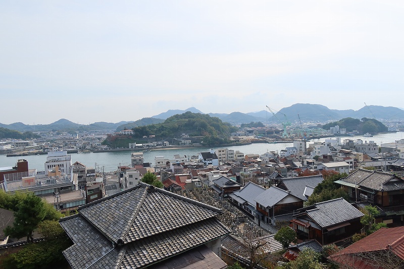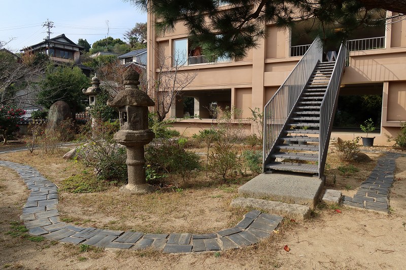 建物をご紹介しよう。尾道駅からはそれほど遠くないが、山陽本線のガードを過ぎると、延々と階段が続く。息を切らしながら登り、右手に高い塀が見えてきたら、そこがLOGである。やっと着いたかと振り返ると海が見える、門を入る前から絶景の場所だ。