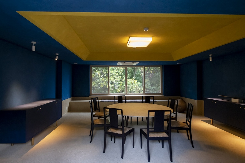 2階の奥にはプライベートダイニングがあり、こちらはドキッとするような鮮明な青と黄色の部屋。ここで食事をしたら元気が出るに違いない。