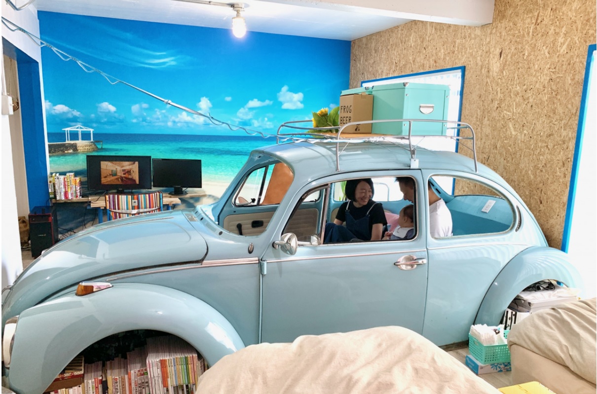久々にぶっ飛んだリノベーションもあった。審査員はもちろん、参加したすべての人が同意するだろう、その作品はフリーダムリノベーション賞を受賞した「ビートルに乗ってリゾートへ?いえ、ここは団地の一室です」(株式会社フロッグハウス)。タイトルの通り、築40年余りの、和室2・洋室1の3DKの1室に水色のビートルの車体が鎮座。異彩を放っているのである。車体はモニターを繋いで映画鑑賞部屋、ベッド、子どものプレイルームなど住み手次第でいろいろな使い方ができるとか。自宅なのに非日常な空間である。