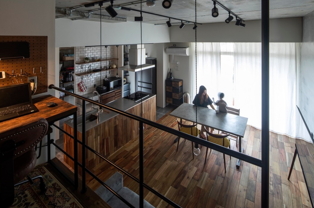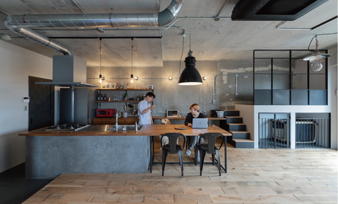 本題に戻り、縦方向に空間を使ったリノベーションではロフトを設置した作品が複数見かけられた。もともとはごく普通の4LDKマンションを専有面積の半分をリビングにあて、ロフトを作った「変化を刻むインダストリアル」(株式会社サンリフォーム)はキッチンとリビングの高さも変えてあり、実に立体的。