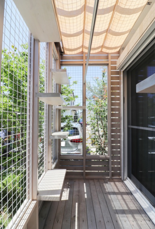 そこまでの広さはないものの、良いアイディアと思ったのが「『愛猫専用テラス』猫と暮らす家」(株式会社アールプラン)。猫たちのために作った畳1枚ほどの小さなサンルームは風、日差しが入る半戸外空間で洗濯物を干すスペースとしても利用できるという。解説からは人間がそこで猫と一緒に日なたぼっこすることは想定されていないようだが、写真を見ると陽光が外に出ておいで、猫と一緒にのんびりしなさいと手招きしているようである。