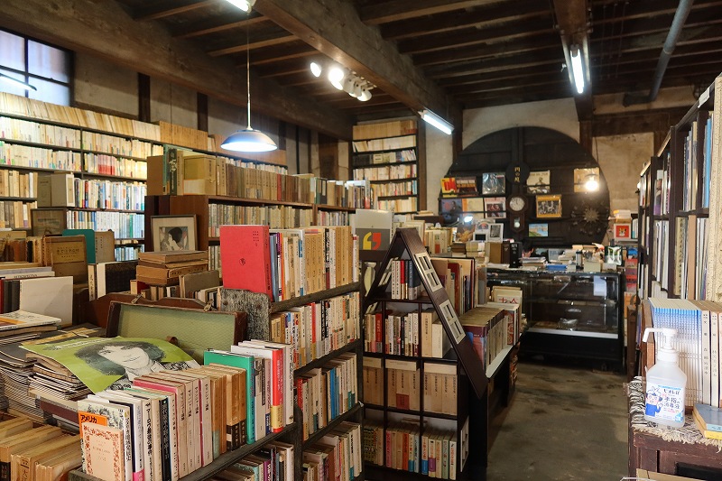 中庭に面して広い店舗を構えるのが古書店・須方書店だ。明治・大正時代に出版された古書から最近の本まで幅広く扱っており、本以外にもレコードやCD、DVD、絵葉書なども置かれている。特定のジャンルにこだわっているわけではないそうだが、個人的には映画関連の書籍や作家の全集などが目に付いたところ。店内には古いポスターなどがところどころに貼られ、昭和の時代の古書店といった趣もあって、絵になる空間である。