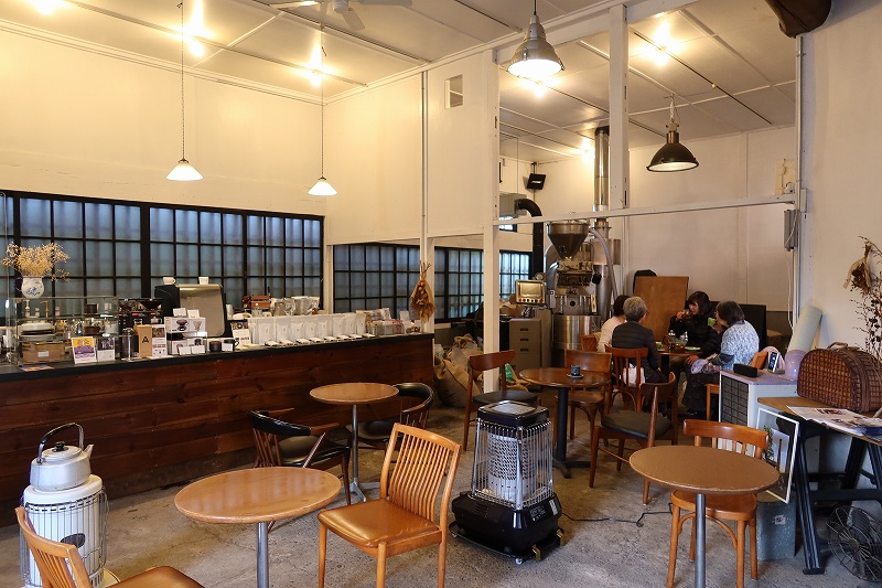その向かいにあるのが50 COFFEE&ROASTERY。瓶詰作業に使われていた工場の跡地を利用しており、3mという天井の高さを生かして熱風で焙煎するアメリカ最新鋭の焙煎機が置かれている。焙煎には直火式、半熱風式、そして完全熱風式とあり、完全熱風式は豆の繊細な風味が出やすいのだ。天井の高い空間に鎮座する焙煎機は埼玉県では1台しかないそうです、と竹石氏。訪れたらその味わい、ぜひ試してみていただきたい。