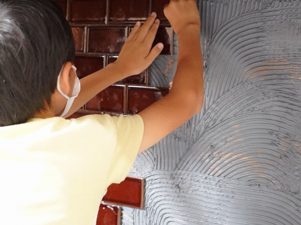 タイルもみんなで貼った。実はタイルの裏側にはメッセージが書かれているのだとか。タイル貼りを手伝ってくれた子は、一緒に来店した友だちに「このタイル僕が貼ったんだ!」と自慢しているそう。そんな姿を見るのもあいざわさんの楽しみになっているのだとか建物の改修も仲間が集まり、できる限り自分たちの手で行った。子どもたちも一緒になって手伝ってくれたそうだ。