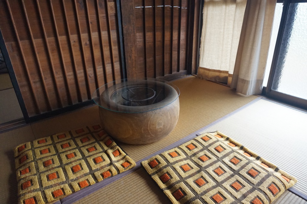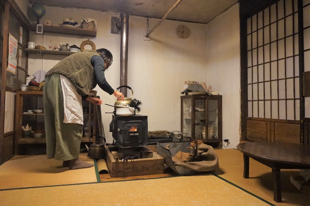 宿の間取りは、窓側にゲスト用に二間あり、その奥に小さなフリースペースがある。いずれも高い天井で、壁はピンク色の土佐漆喰の土壁だ。玄関は土間になっていて、そのまま台所につながっている。さらに居間があって、薪ストーブが赤々と火をたたえていた。思わず外の雪でかじかんだ手を温めた。