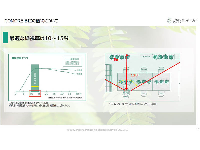 緑のある空間で仕事をするのは、机と椅子だけの何もない空間よりもストレスが少なく、作業効率も高くなる。誰もが何となくわかっている「緑の効能」を、事業として追求しているのが、パソナ・パナソニック ビジネスサービス株式会社の「COMORE BIZ(コモレビズ)」だ。