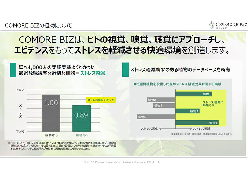 同社は、パナソニックの総務業務を受託していたパナソニックビジネスサービスと、パソナが資本提携をして2015年に誕生した。コモレビズは2017年にスタートした事業で、バイオフィリックデザインの考えに基づいて、適切に選んだ植物を最適に配置し、音響や香りにも配慮した空間設計で、快適な職場環境を提供するというもの。バイオフィリックデザインとは、人間は本能的に自然を好み、自然を求める傾向があるという、アメリカで1980年代に提唱された「バイオフィリア」の概念を反映した空間デザインの手法だ。心身の健康に寄与するといわれ、幸福度や創造性、生産性の向上が期待できるとされている。