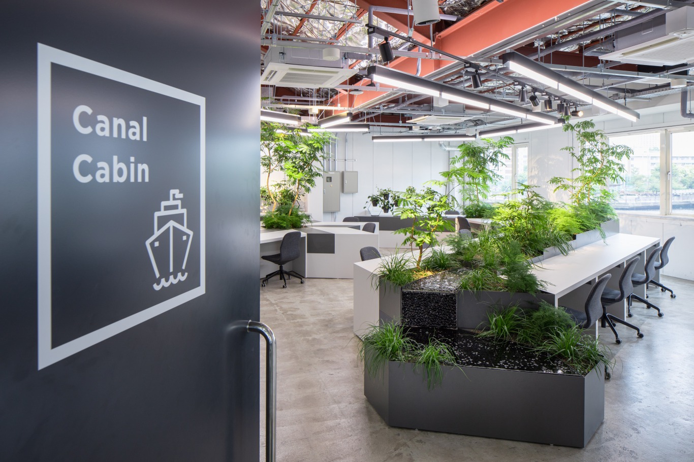 運河に面した「CANAL CABIN」は約100m2で、最大24名が同時に利用できる。デスクの周囲には多くの植物が配されていて、「緑に囲まれて作業をする」といった表現がオーバーに思えない雰囲気。岩月氏によると、生産性や空間満足度が高まる植物の量は、豊橋技術科学大学 松本博名誉教授らの研究の結果、「緑視率」で10%から15%とわかったそうだ。緑視率とは「人の視界に占める緑の割合」で、緑の多さを表わす指標のひとつとなっている。用いられている植物は、同じく実験によってストレス軽減効果があるとわかった種類のもので、コモレビズのパ-トナー企業の専門家が、月に2回程度メンテナンスを行っている。延べ4,000人を対象に行った実証実験によると、適切な植物が適切な緑視率で配置された空間は、植物のない空間に比べて、ストレス値は約10%低下したそうだ。