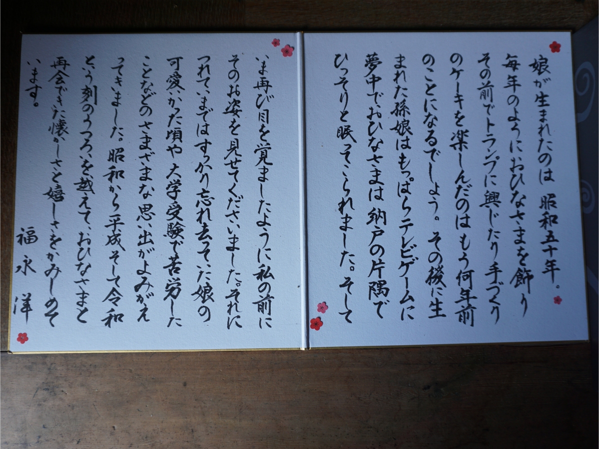 「私は森昌子さんのファンで、彼女の『雛ものがたり』という歌から、すべての雛人形に物語があるという発想を得ました。そこで、持ち主に雛人形にまつわる思い出を教えてもらい、雛の横に置いたのです。これが高評価をいただきました」