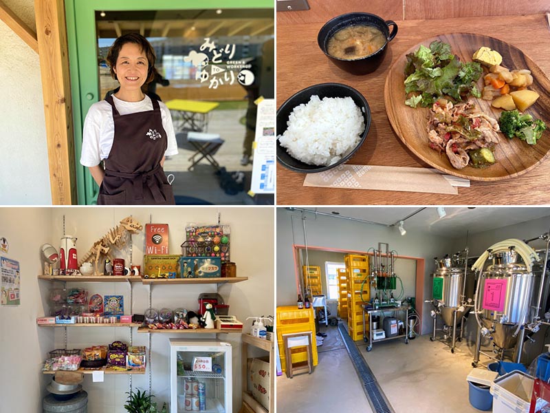 宗像市は古くから漁業や農業が盛んな場所で、「みどゆか」では地元食材や名産の紹介に力を入れている。小さな子ども連れでも過ごせるように、畳のコーナーも設えられており、幅広い世代が利用する。朝8時から開店し、「さとの朝ごはん」や「昼ごはん」といった食事メニュー、アレルギー対応の米粉ドーナツ「もぐもぐポケットドーナツ」などのデザートやドリンク、「ひのさと48」内で醸造しているクラフトビール「さとのビール」も提供する。