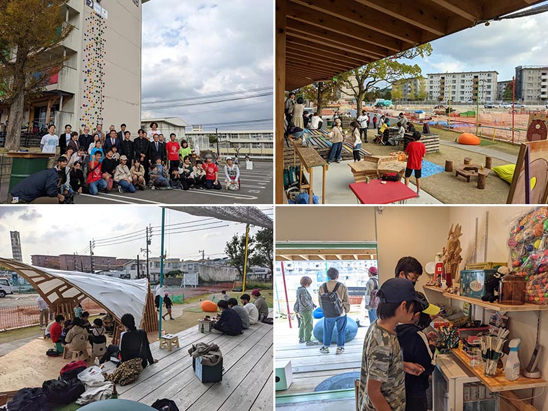 11月3日にはクライミングウォールも完成、賑やかなオープニングセレモニーが開催された。「みどゆか」もお弁当や駄菓子の販売、ランチの提供でてんてこ舞いだったようだ。このときは九州大学の学生たちが「ひのさと48」の102号室「じゃじゃうま工房」の木材加工機「Shopbot」を借りて卒業制作でつくった構造物を展示。子どもたちにとって格好の遊び場になった。