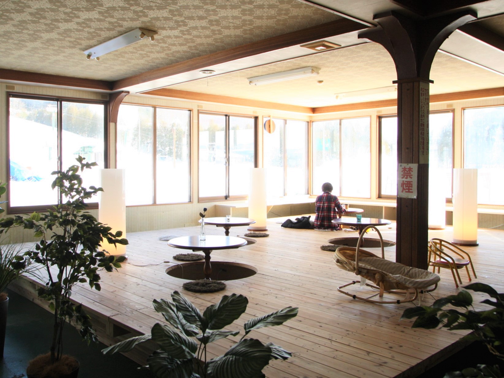 ラウンジでは高めの床に掘りごたつ型のテーブルを置き、ゆったり滞在できるように工夫。サンフレークが展開するカフェもセンターハウス内に設け、フードにもこだわる。