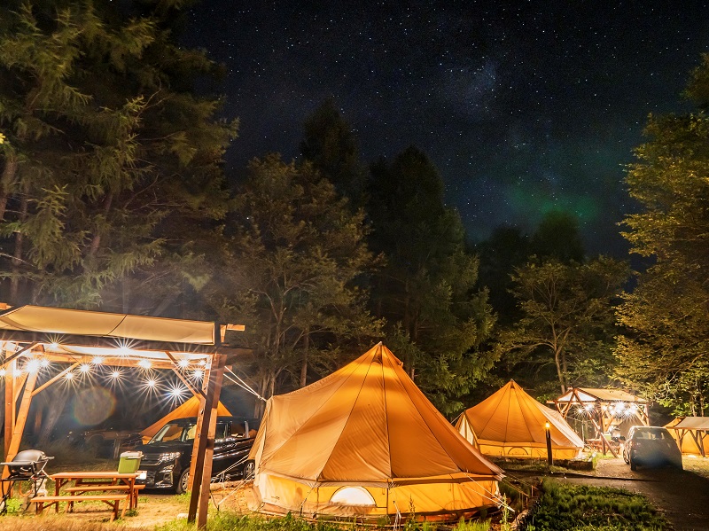さらに、2018年に廃止されたオートキャンプ場の活用を模索していたH&Rが、取引のあったリゾート地への人材派遣業を営む「株式会社ダイブ」(東京)を誘致。2021年にグランピング施設がオープンした。スターライトホテルから車で2分の雄大な自然の中、「童話の世界」をイメージした客室や、満天の星空の下での焚き火などをアピールしている。