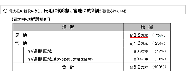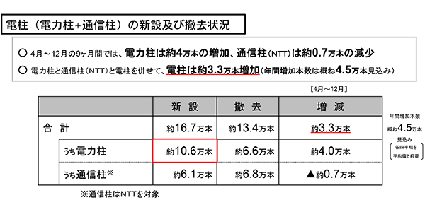 9ヶ月の間に約13.4万本も撤去しているが、新設も約16.7万本もあり、差し引きすると約3.3万本増えてしまっていることになる。撤去はそれなりに行っているものの、それ以上に新設があるため、全体としては減少に至らない状況だ。増加した電柱の内訳を見ると、電力柱は+約4.0万本であり、通信柱は▲約0.7万本となっている。通信柱は減少に貢献しているため、増加の原因は電力柱にあるということだ。