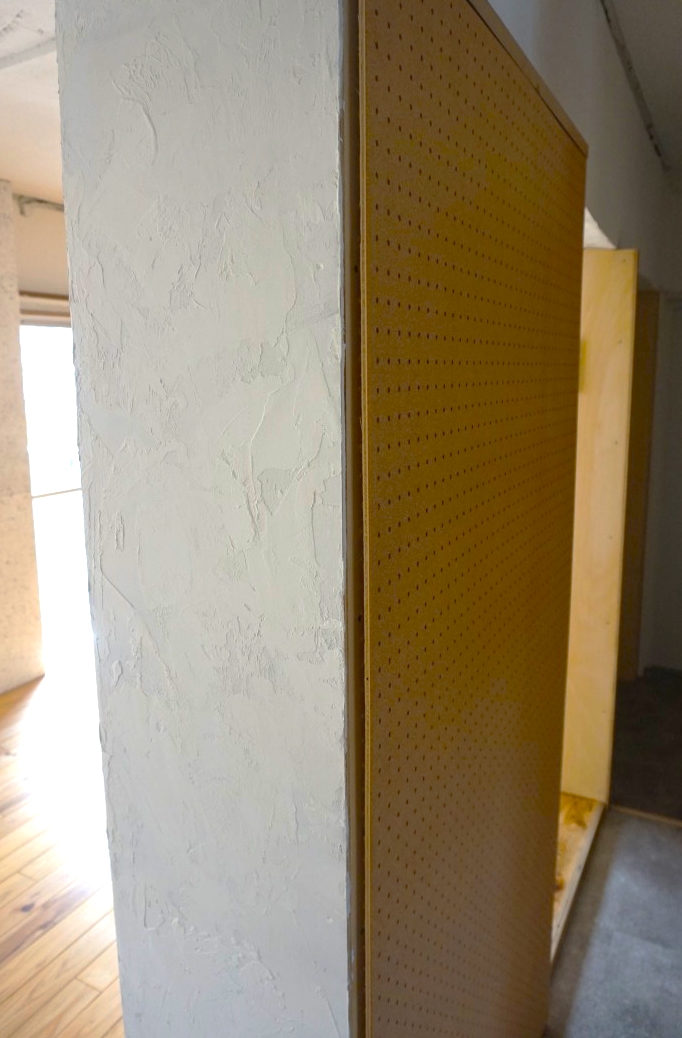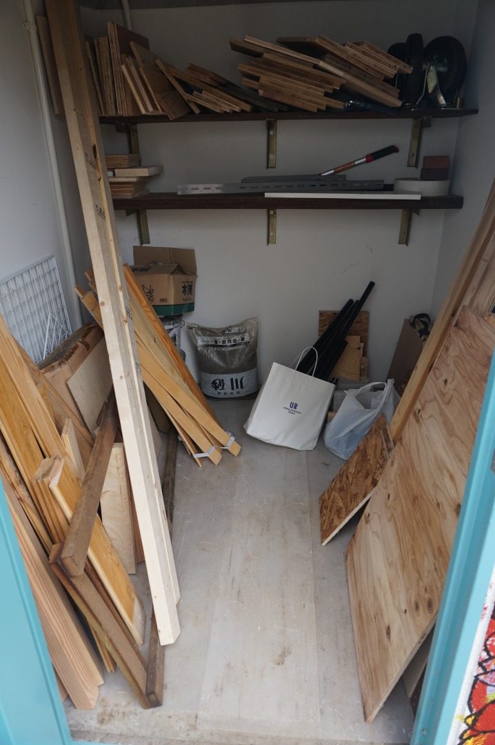 最近のマンションは、作り付けの家具が多いなか、いろどりの杜は内装がスケルトンタイプのため、収納家具がほぼない。必然的に棚が必要になり、そこで、このシェア工房が役立つのだ。ちなみに、事前に管理会社へ申請して許可をもらうと、室内のベニヤ板の壁へ、ビスを打ったり、色を塗ることが可能になる。