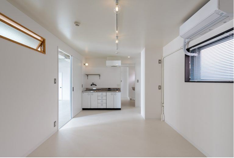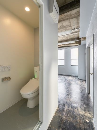 白い壁の向こうには居住スペースがある。洗面、キッチン、トイレなどはすべて新品が設置され、こちらはクロス、天井、床も真っ白で、仕事場とはまったく異なる印象だ。「仕事場」と「住まい」を明確にゾーン分けし、パブリックとプライベートが両立できる空間として設計されている。