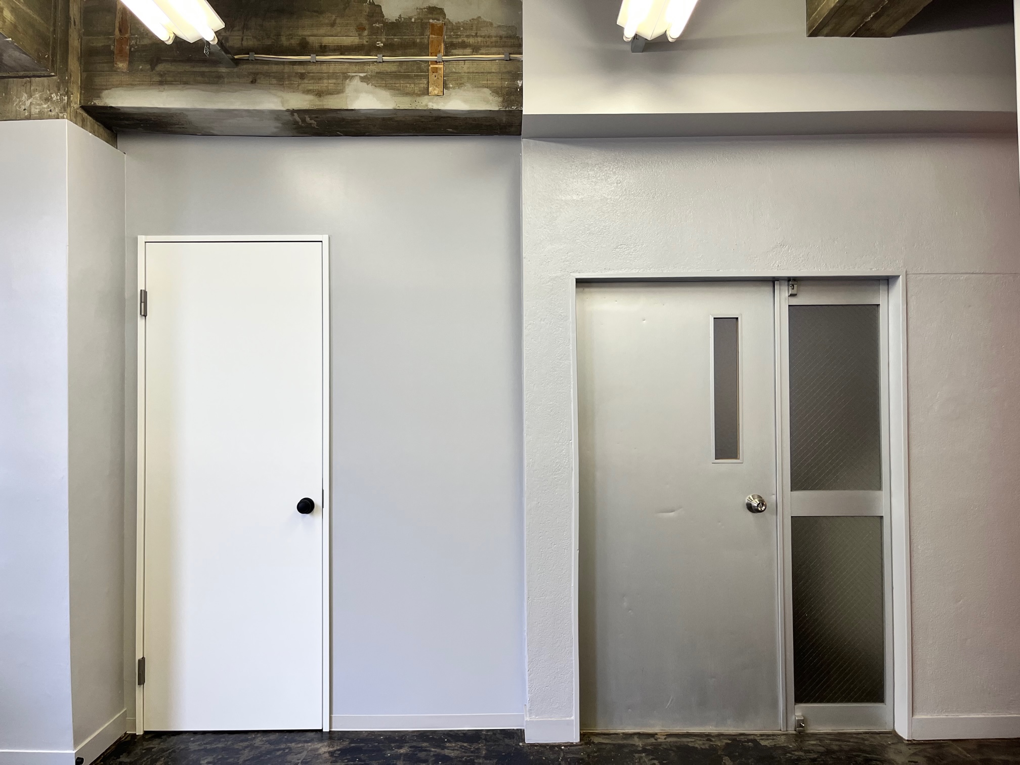 従来のドアをそのまま利用した入り口を開ければ、スペースの半分強をオフィススペースが占める。内装材を剥がし、クリア塗装を施した床は、レトロで温かくどこか懐かしい雰囲気を醸し出す。なんといっても、高い天井高と広々とした空間が、創作やクリエイティブな仕事にぴったりだと感じた。